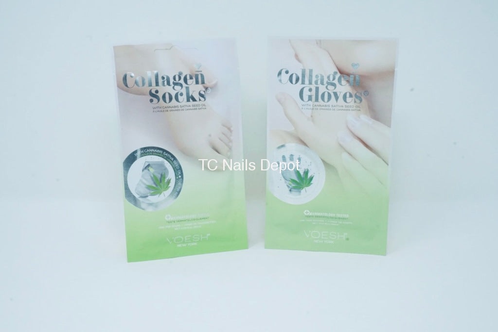 VOESH Collagen Socks and gloves are enriched with phytocollagen , hemp seed oil, and eucalyptus extracts. It delivers an intense dose of moisture to visibly restore youthfulness to the skin.
